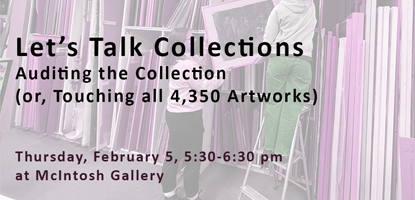 After seven months of auditing the collection, Emily Henry, Collections Assistant, and Rachel Deiterding, Curator of Collections and Special Projects, will share an inside look at some of the most interesting and challenging artworks that have been uncovered so far. "Let’s Talk Collections" is a public conversation series that makes visible behind-the-scenes work with the collection, with a focus on the ongoing multi-year collections audit and review. This work will culminate in a collection development plan that will guide the future of the collection. This event is free and open to the public.